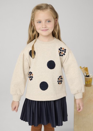 Two piece outfit in a slinky fabric, sleeveless dress with pleated skirt, and dressy pullover with patterned dots and sparkly threaad.