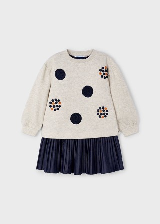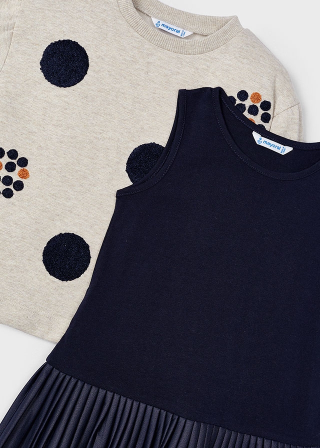 Two piece outfit in a slinky fabric, sleeveless dress with pleated skirt, and dressy pullover with patterned dots and sparkly threaad.