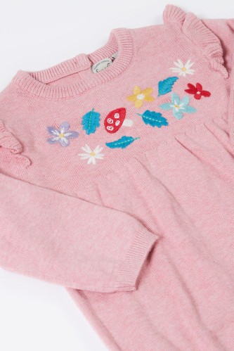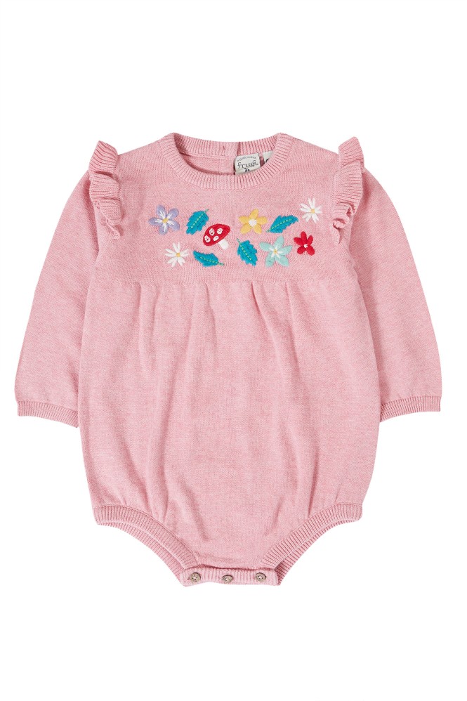 Crafted from soft and snuggly organic cotton knit, this machine washable baby romper has pretty frilled sleeves and embroidery details, plus handy button fastenings at the back and popper fastenings underneath for easy-peasy nappy changes.