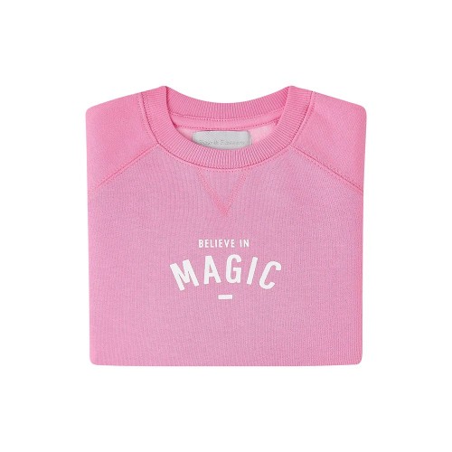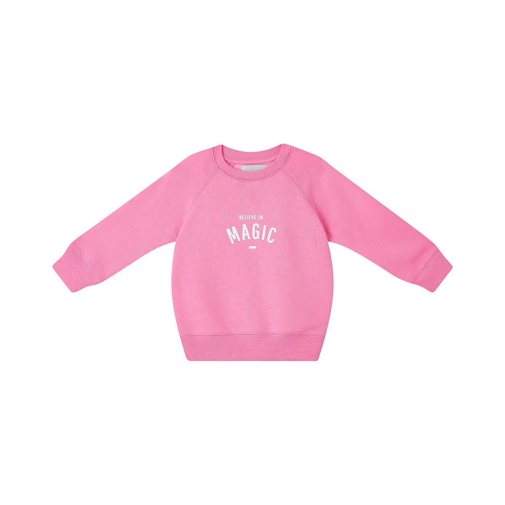 A relaxed / baggy style Hot Pink sweatshirt with a white 'BELIEVE IN MAGIC' print - designed to be a loose fit, size down for a less over sized look.