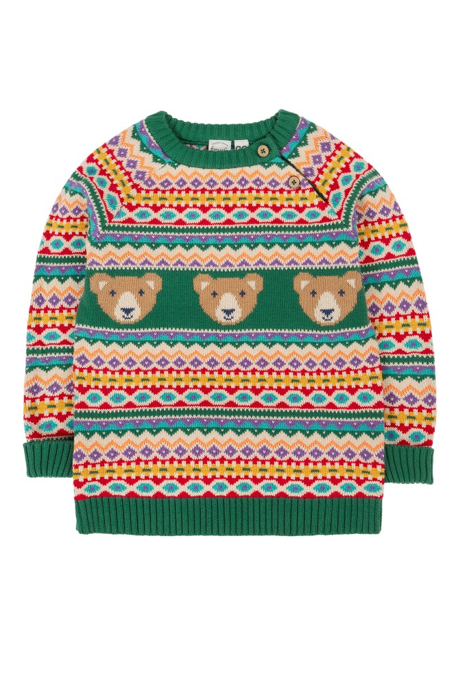 This super soft and snuggly Fowey Fairisle Knitted Jumper is crafted from organic cotton and ready for playtime! With wood-effect buttons on the front, this machine-washable jumper for toddlers and kids also has extendable rib cuffs, allowing it to grow with little ones for adventure after adventure.