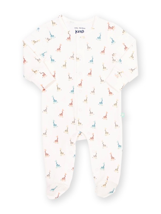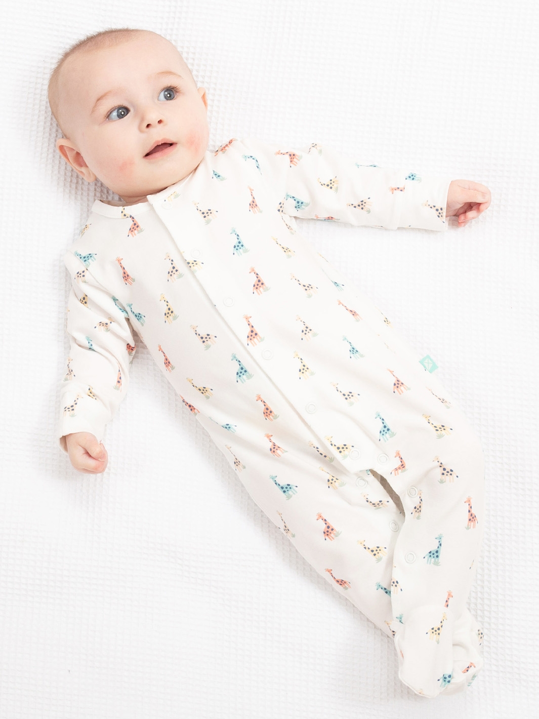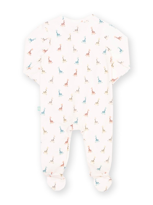 A beautifully soft sleepsuit in the Sweet Giraffe design. Featuring a full, y-shaped popper opening on both legs, nappy changes are easy-peasy.