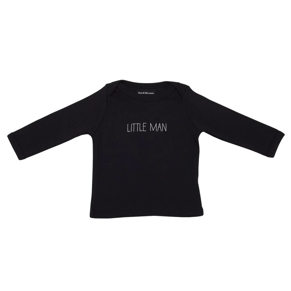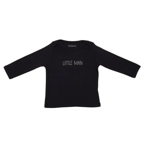 Navy cotton t shirt featuring a white 'Little Man' slogan. Our baby t shirts are made from 100% jersey cotton, and feature an envelope neck and long sleeves. Machine washable